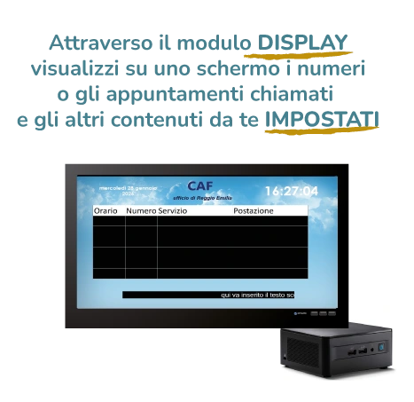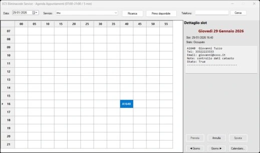 Dedicato a chi riceve su appuntamento. Per ogni servizio si genera un “numero di appuntamento” che può essere comunicato a voce o via email al destinatario. Verrà così creata quotidianamente una lista di appuntamenti che potrà essere gestita comodamente dai client .
